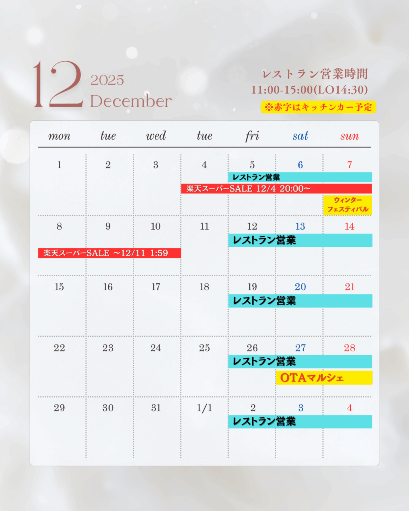 また、年明けの営業は1月2日(火) よりスタートいたします。